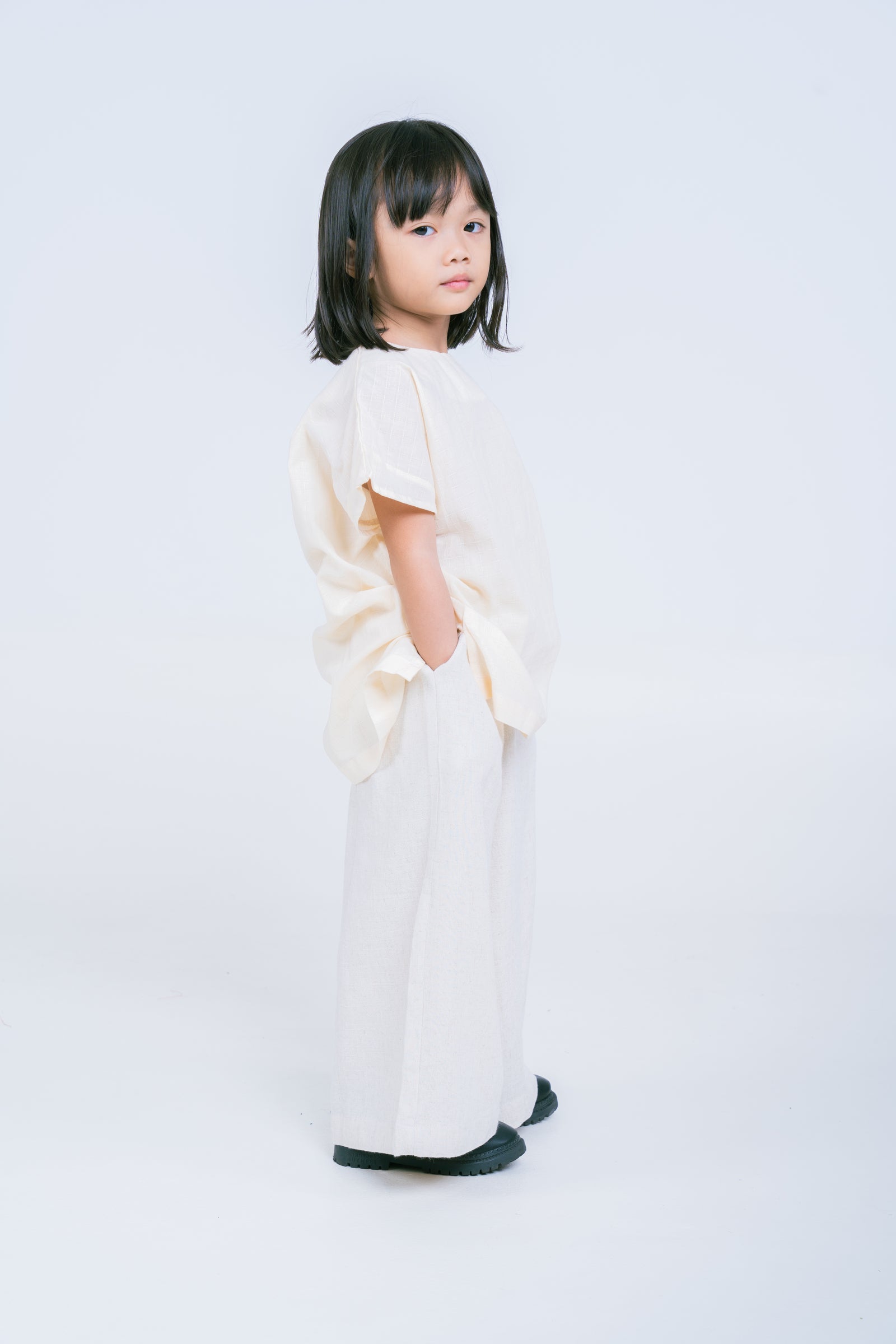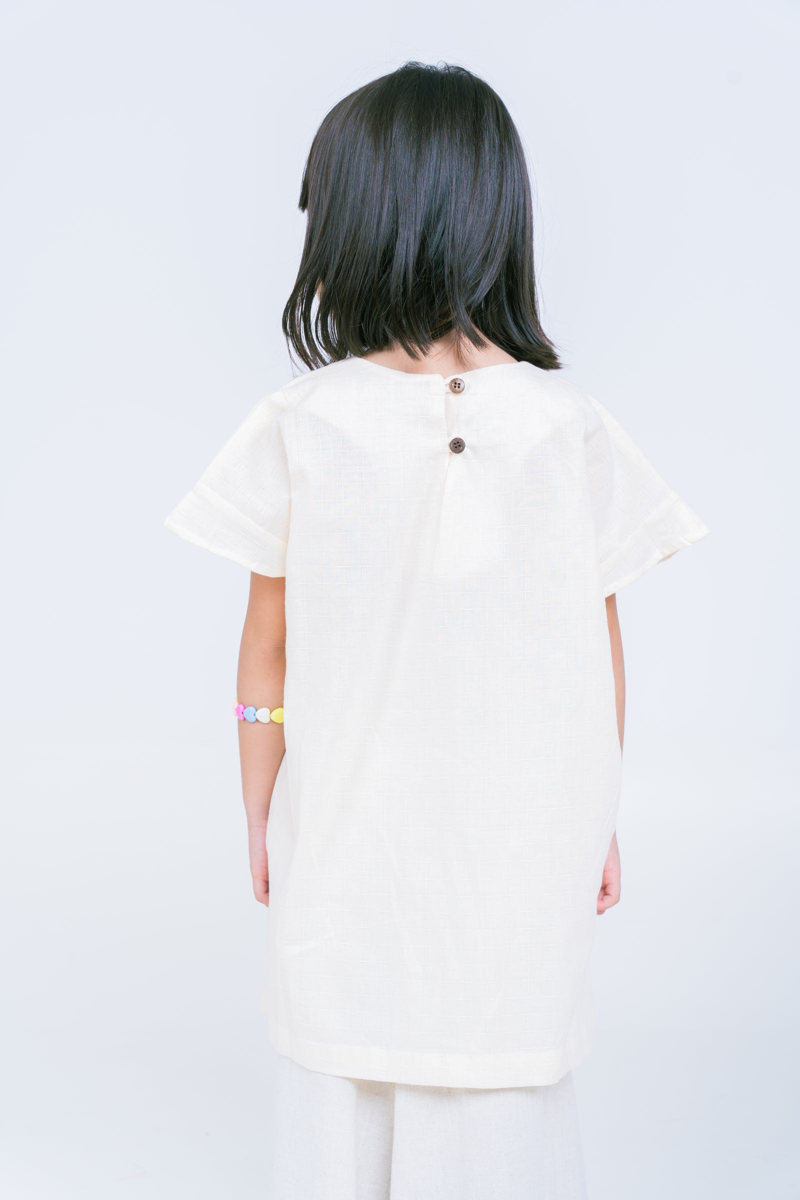With its relaxed fit, this top allows for unrestricted movement and playfulness. The loose fit is perfect for active kids who love to move around and enjoy their day. This versatile top can be paired with shorts, jeans, leggings, or skirts for various cute and casual looks. It's suitable for everyday wear, playdates, or even special occasions where comfort is key. Top with a round cut neckline, back button opening, slip-on type, drop shoulder style, cap sleeves, and relaxed fit is designed to keep kids comfortable and stylish. It's a great addition to their wardrobe, allowing them to express their individuality while staying comfortable throughout their activities.