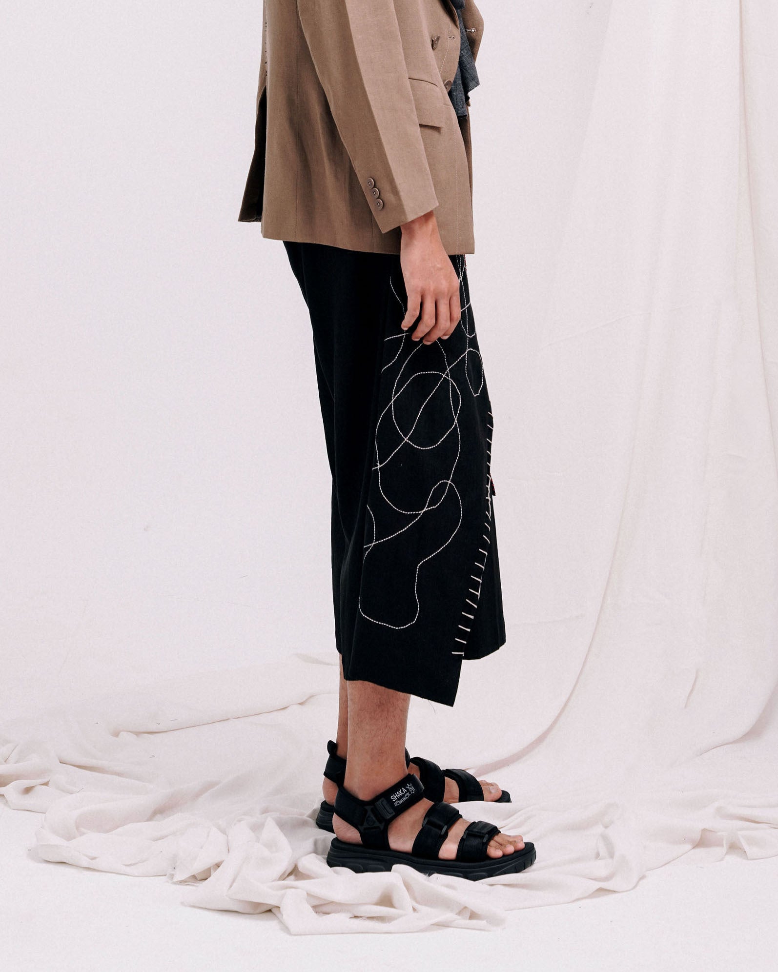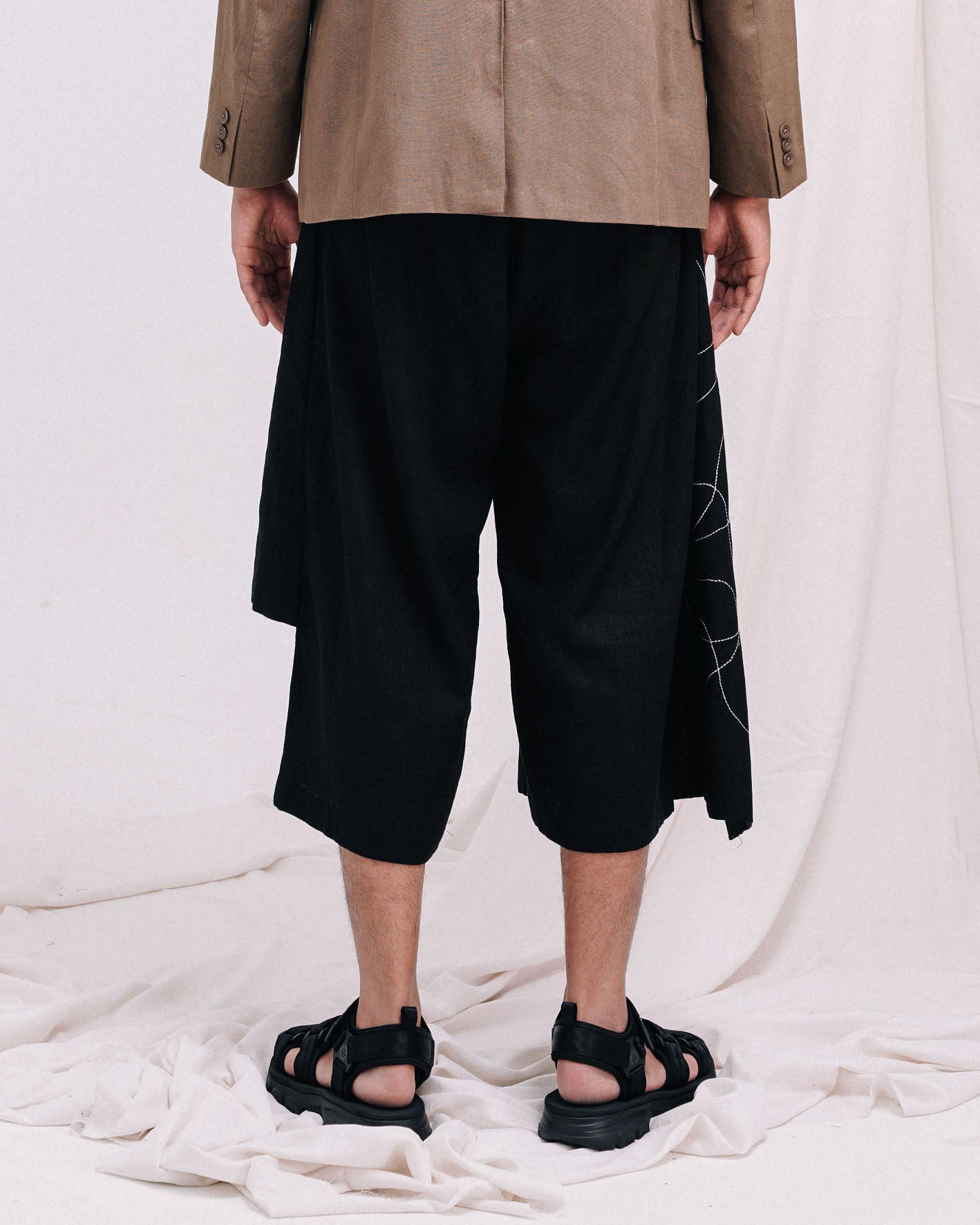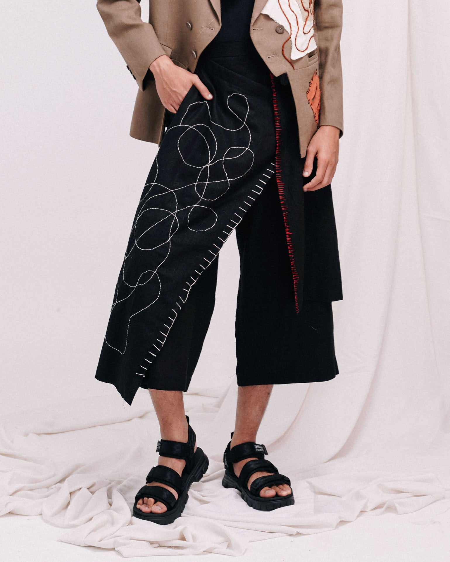 - 3/4th length pants with assymetrial wrap skirt attatched to the side seam (left side wrap being shorter than the rigth side wrap).