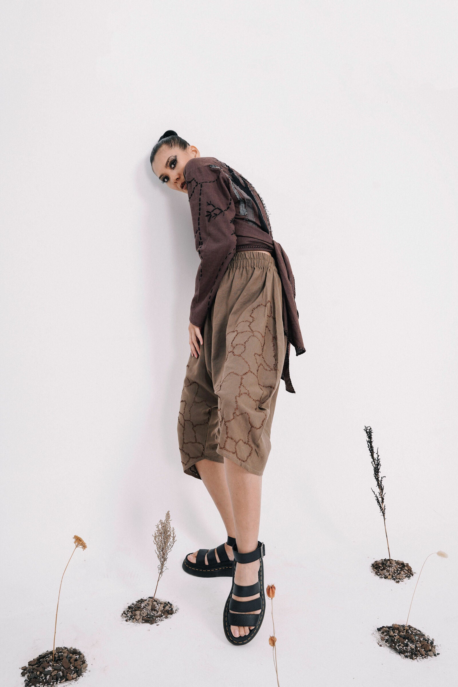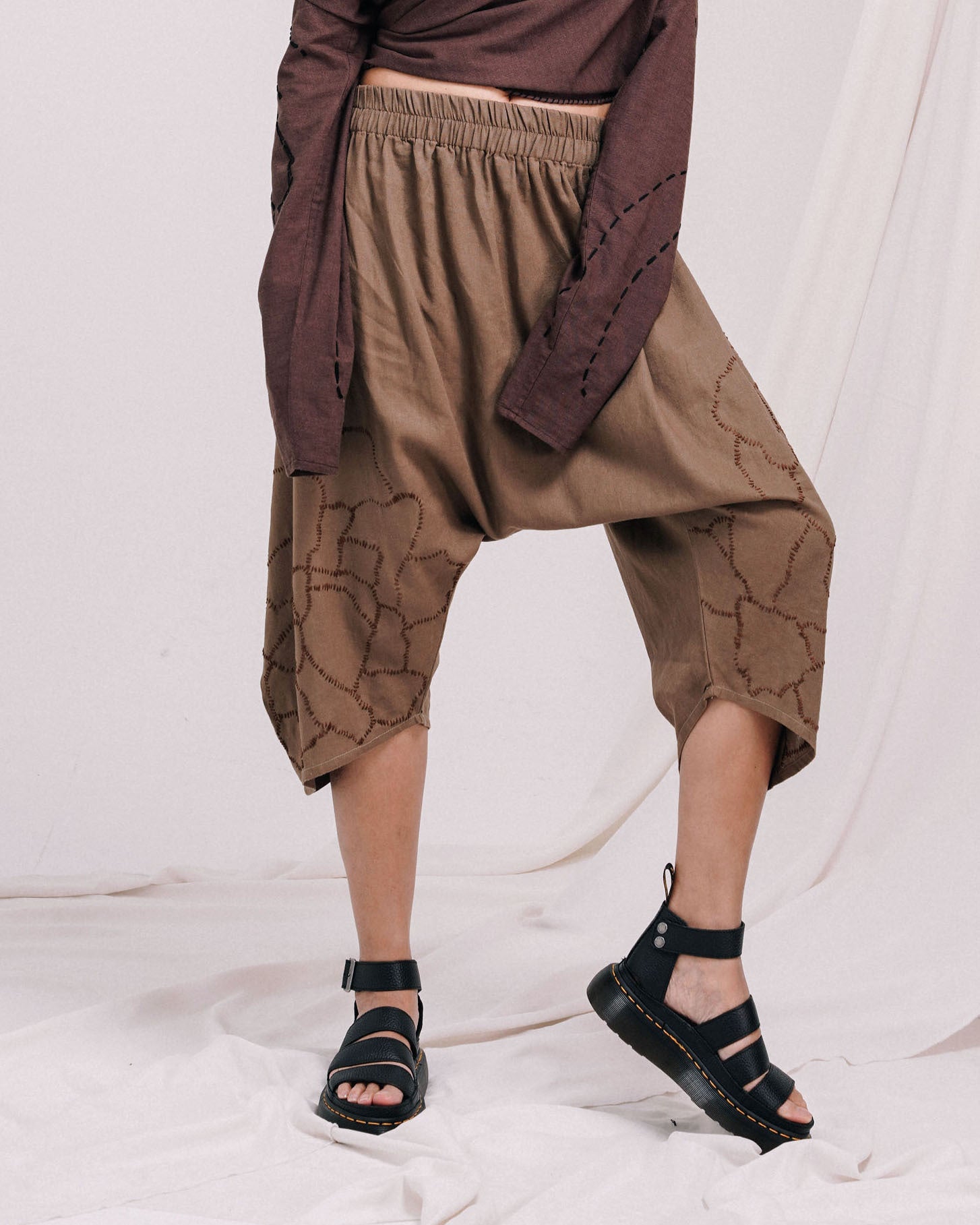 The bottom half of the front pants are hand embroided to replicate cracks on dried and dead soil. Use of brown threads to create depth and enhance the subject matter well.