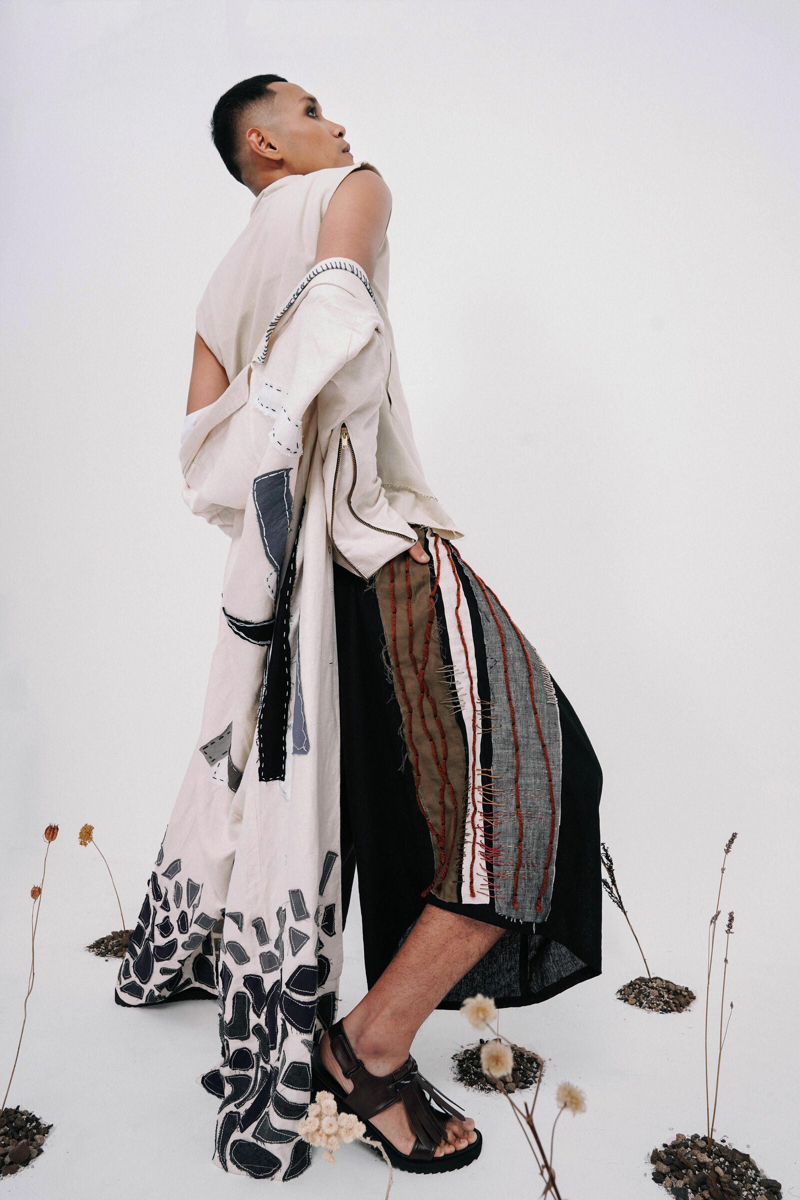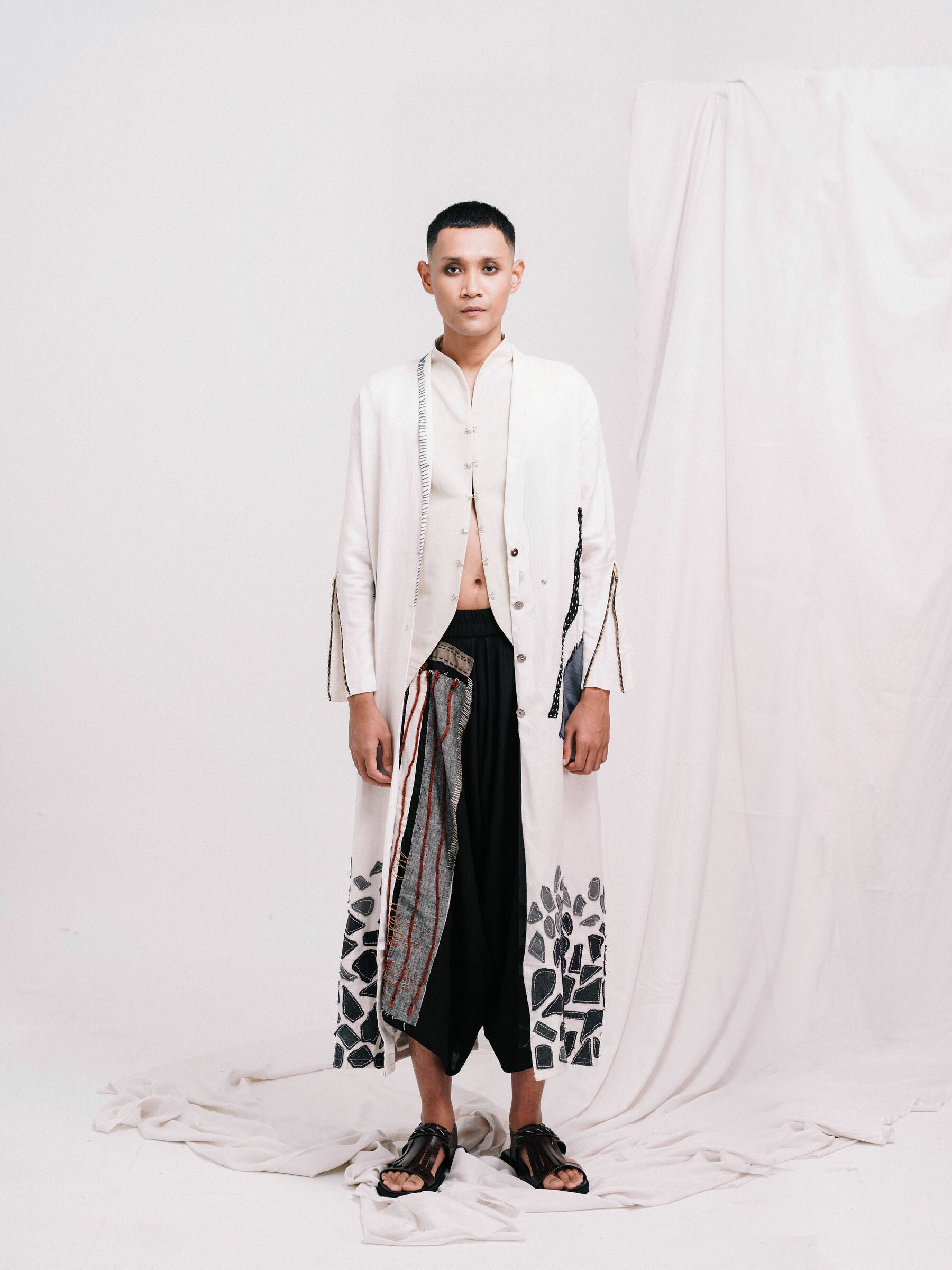 This unisex long outer has been adorned using the concept of "Ice". The patchwork on the garment represents the ice movement as an effect of global warming. The boro stitching on the patch work symbolyses the mending technique known as wabi-sabi.