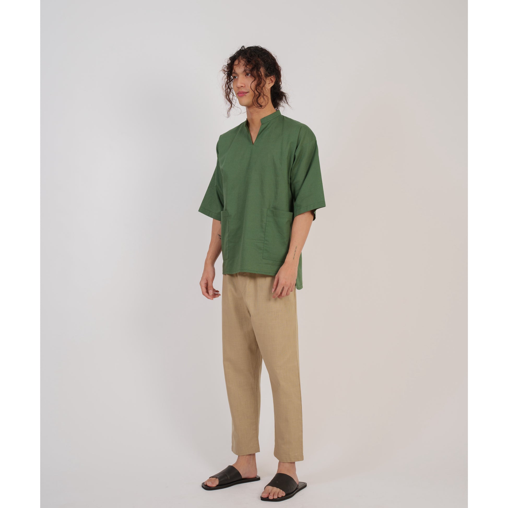 occasions. The sleeves and mandarin collar offer a modern aesthetic, while the front pockets provide utility and extra flair. This shirt balances comfort, style, and practicality for the modern man.