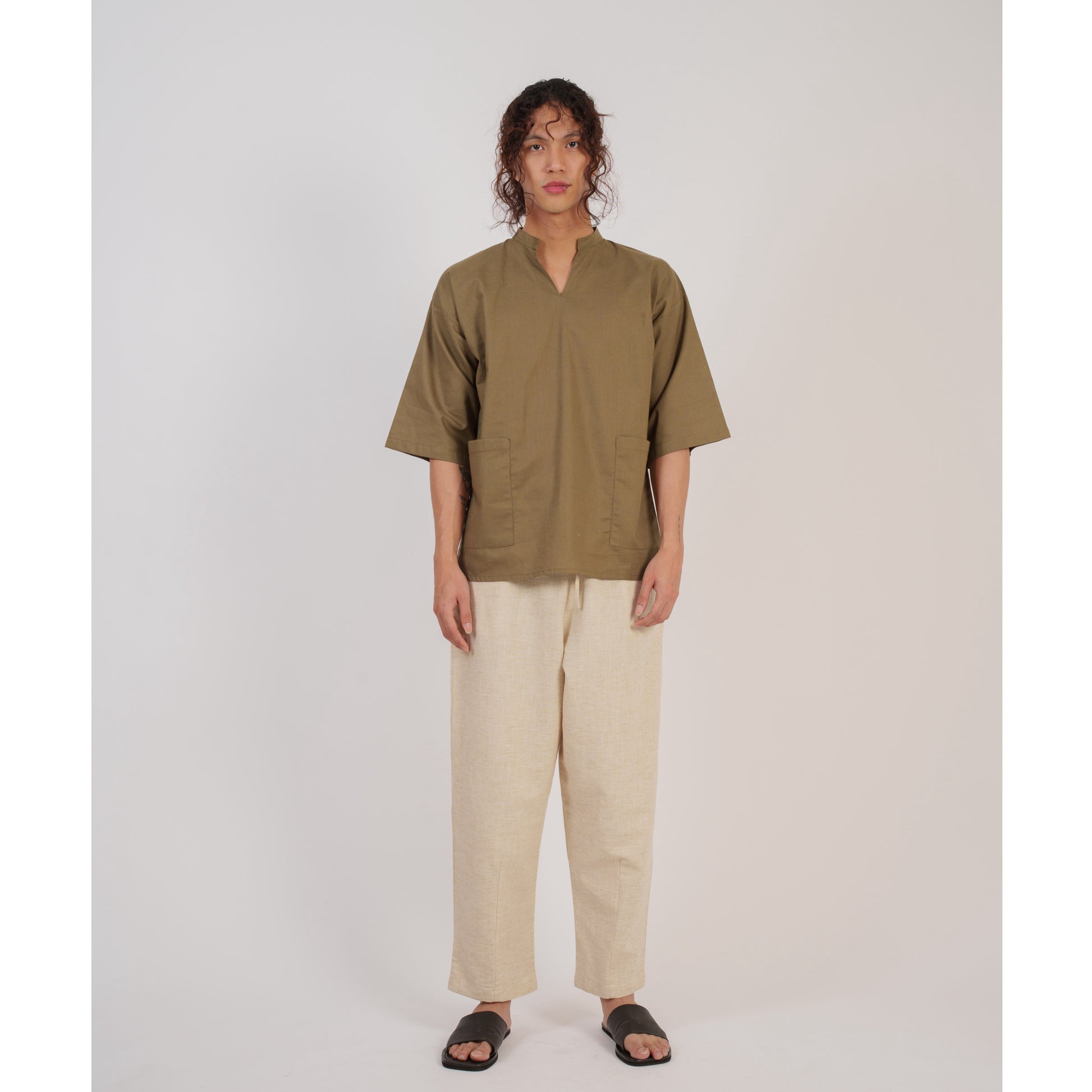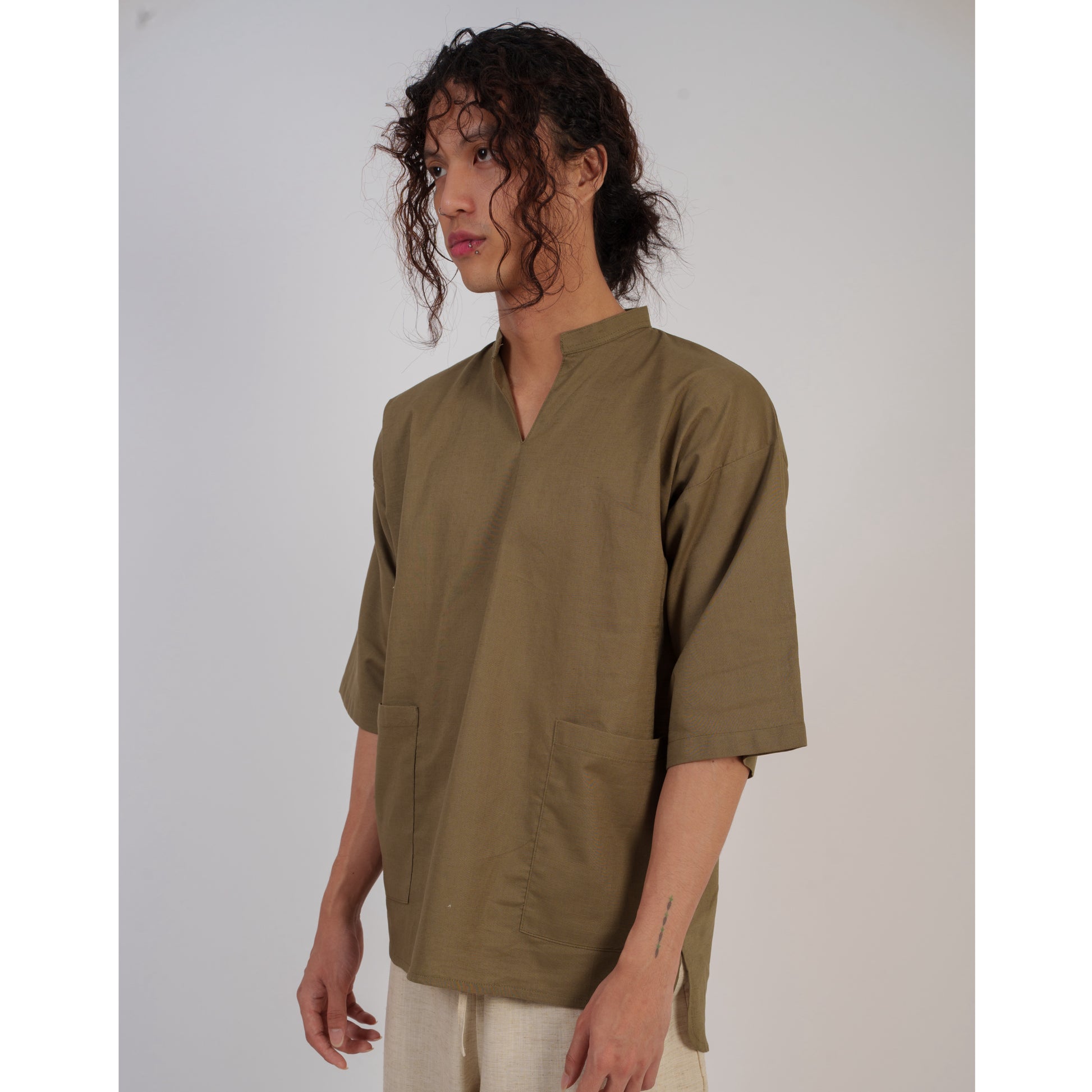 occasions. The sleeves and mandarin collar offer a modern aesthetic, while the front pockets provide utility and extra flair. This shirt balances comfort, style, and practicality for the modern man.