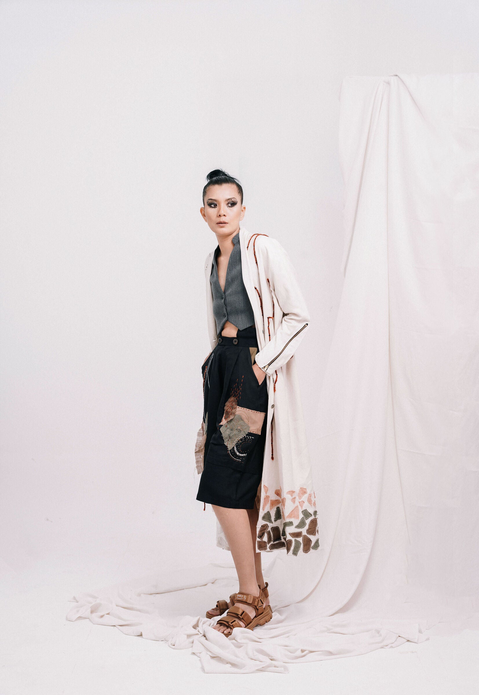 - Back neck slit on high collar to give an option of wearing the lapel according to preference - to wear one side up and one down/ both sides up/ both sides down.