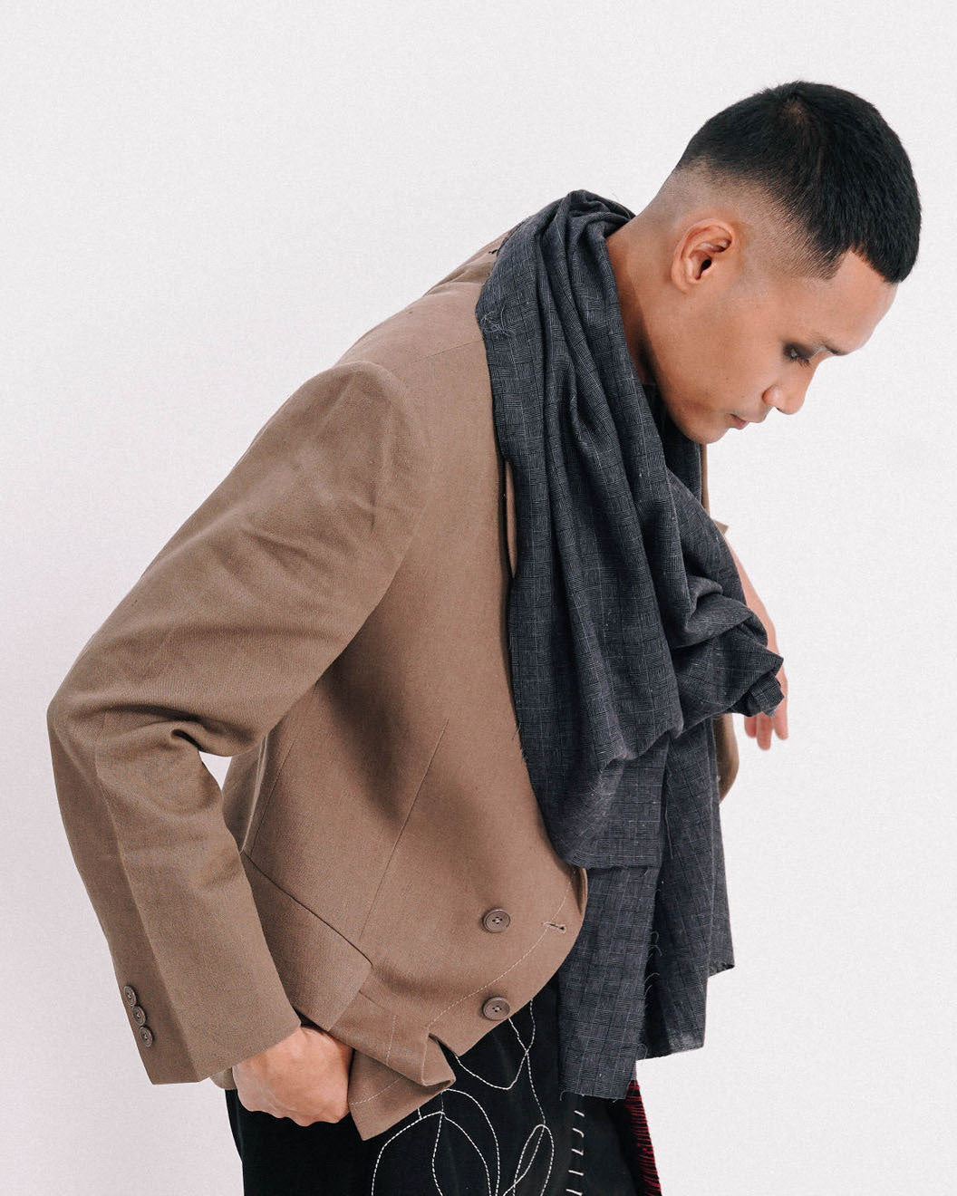 A rectangular shaped Grey toned scarf made from scrap fabric.