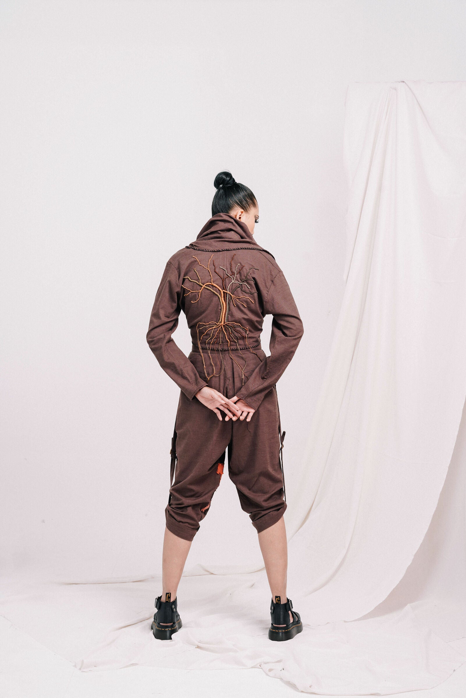 Same blouse as Shinda Mori with a different subject matter. Tree of life has been intricately embroided at the back of the blouse. This is done with different warm colours to represent the colours in a forest fire which is caused by cliamte change.