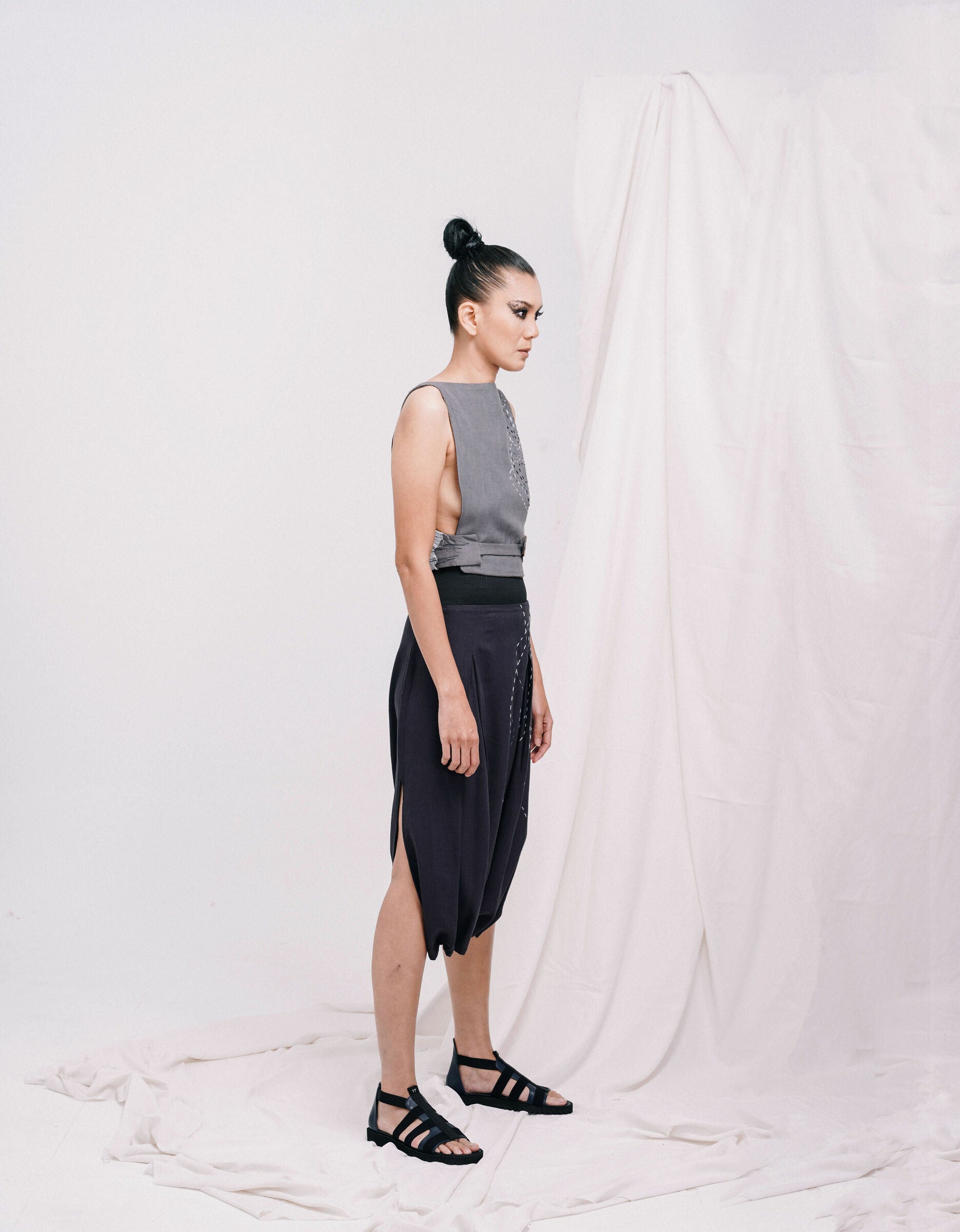 Melting Glaciers being portrayed by placing scrap fabrics and boro stitches in a way that shows flow of ice melting from the shoulders. The front shows the movement of ice melting by the use of boro stitching method.